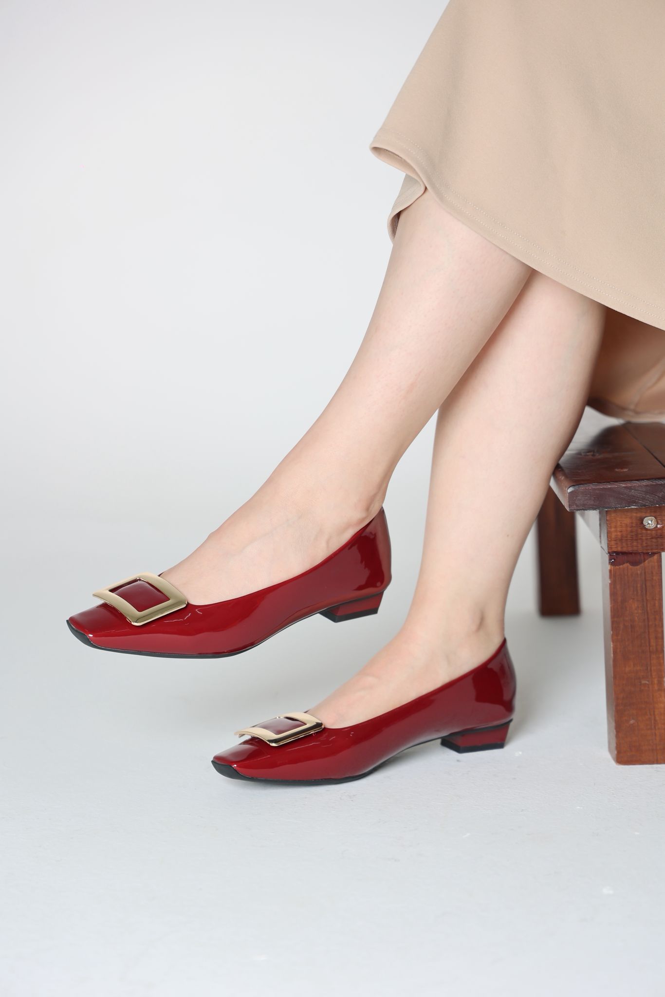 كعب منخفض ومريح، ما يجعله مثالياً للاستخدام اليومي أو لساعات العمل الطويلة دون الشعور بالتعب. تصميمه المغلق يوفر ثباتاً جيداً للقدم، بينما الخامة اللامعة تعكس ذوقاً أنثوياً راقياً يناسب مختلف الإطلالات، سواء الرسمية أو الكاجوال.