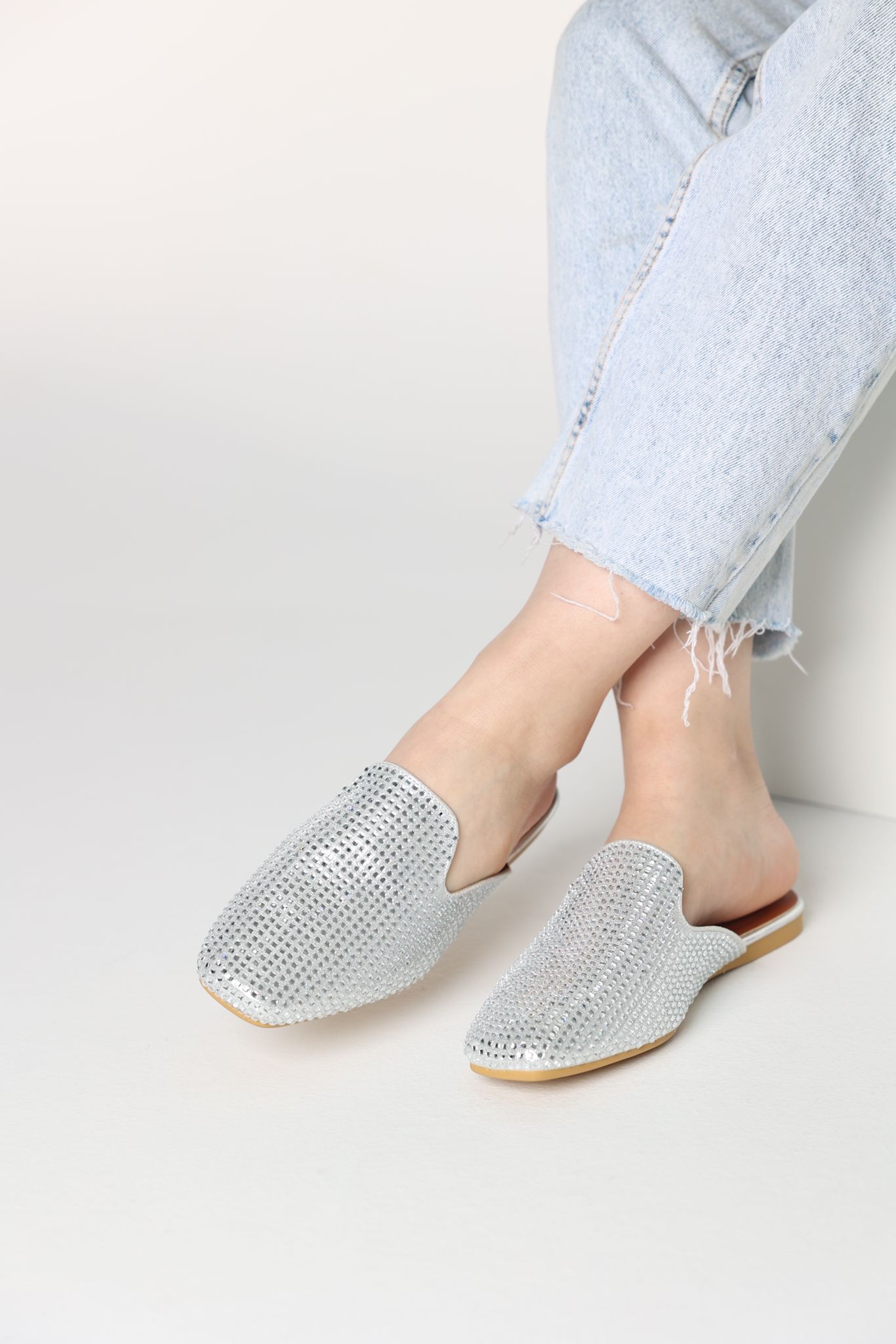 سليبر فضي مزين بستراس لامع، بنعل داخلي مريح وطري يضمن راحة ودعم طوال اليوم، مثالي للإطلالات الكاجوال العصرية.