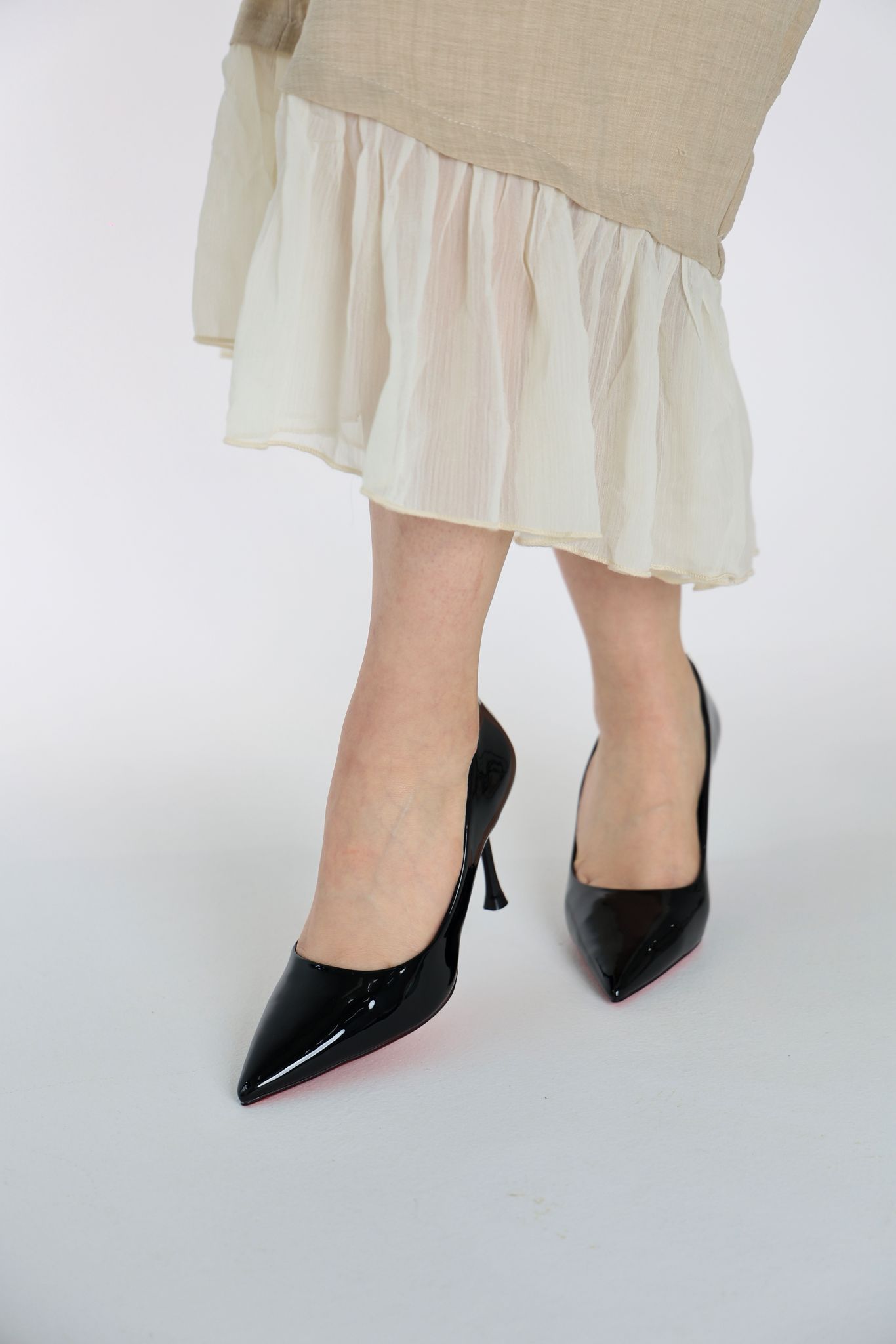 - الوصف: حذاء مغلق يتميز بـ مقدمة مدببة حادة جداً، ومصنوع من الجلد اللامع (Patent Leather)