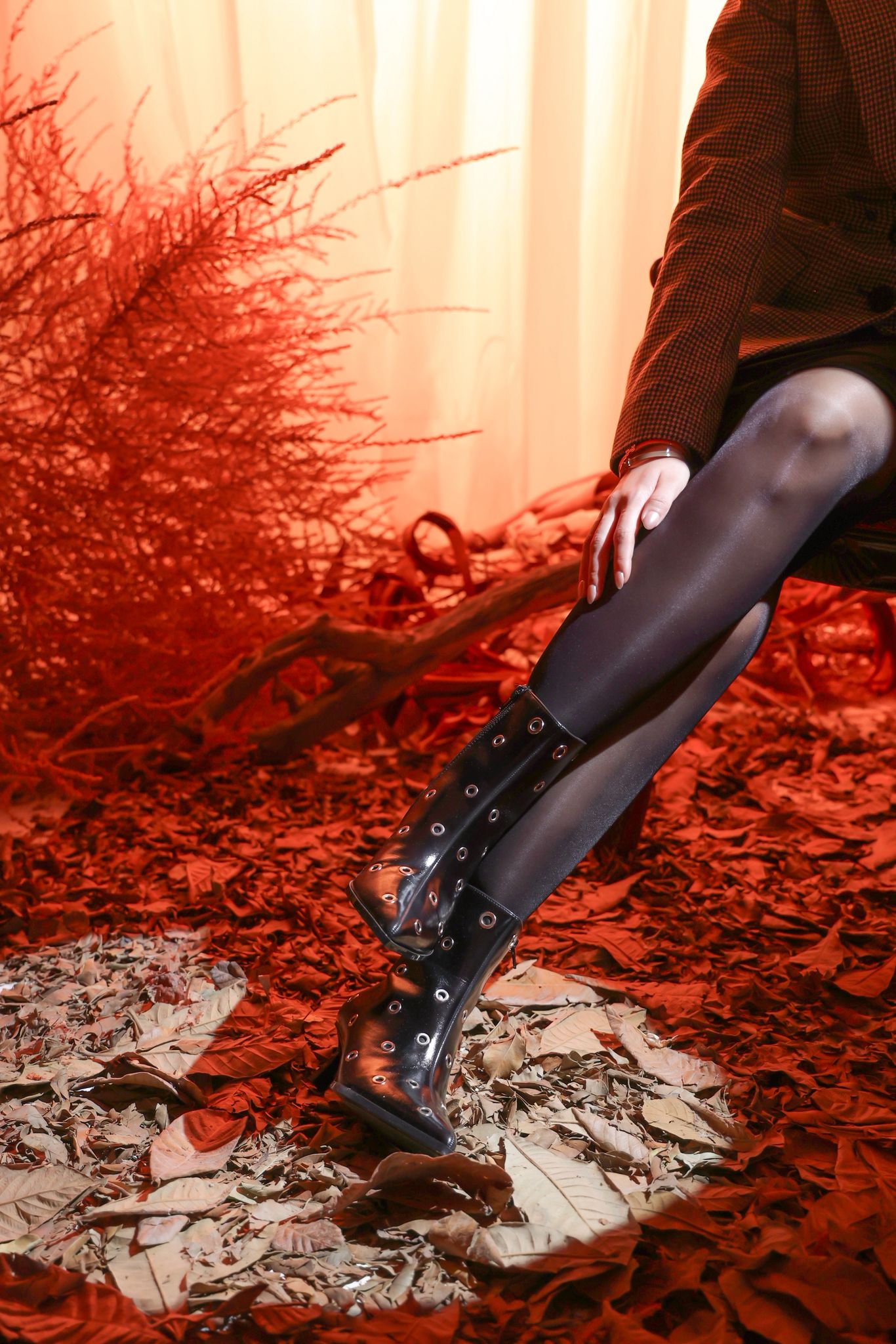 جزمة سوداء بكعب رفيع وتفاصيل معدنية فضية