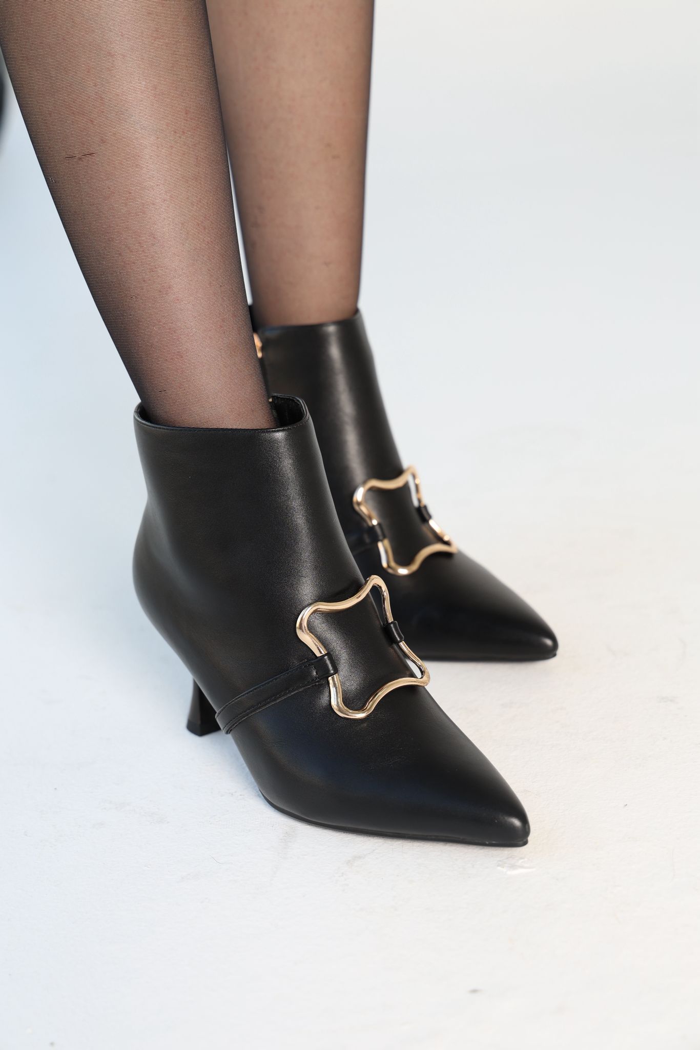 “جزمة نسائية عصرية مصنوعة من الجلد الفاخر، مزودة بكعب أنثوي أنيق يضيف لمسة من الطول والثقة. تزيّنها قطعة معدنية على شكل نجمة