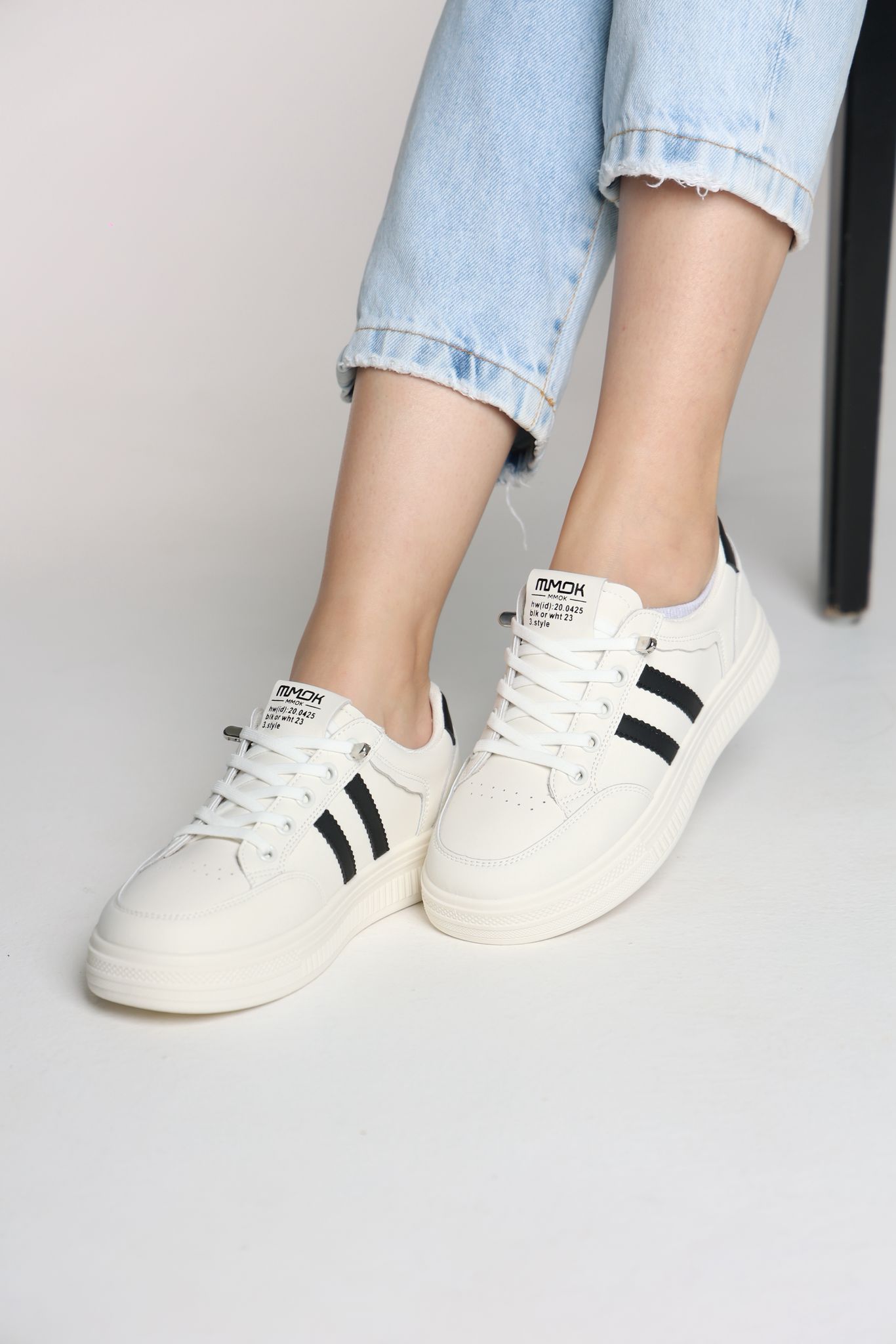 بلون أبيض ناصع مزوّد بخطّين باللون الأسود على الجانبين، مما يمنحه لمسة عصرية وجريئة في الوقت نفسه. يتميّز بخامة متينة ونعل مريح يوفر ثباتًا عاليًا أثناء المشي، مما يجعله خيارًا مثاليًا للإطلالات اليومية والكاجوال.