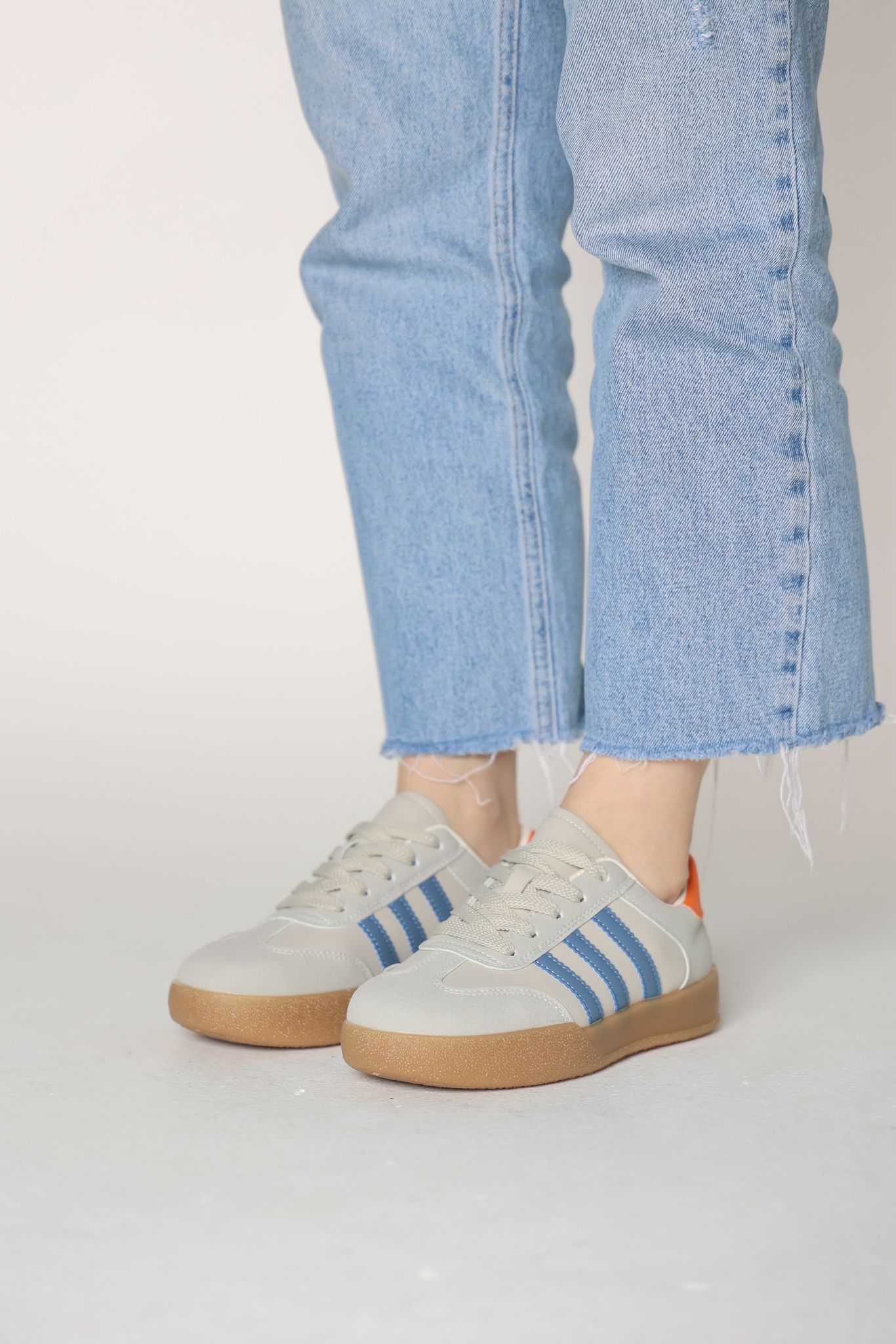 بوت أنيق باللون الرمادي مزين بخطوط باللون الأزرق تضيف لمسة حيوية ومميزة للتصميم. يتميز بخامة مريحة وجودة عالية مع نعل ثابت يمنحك راحة طوال اليوم
