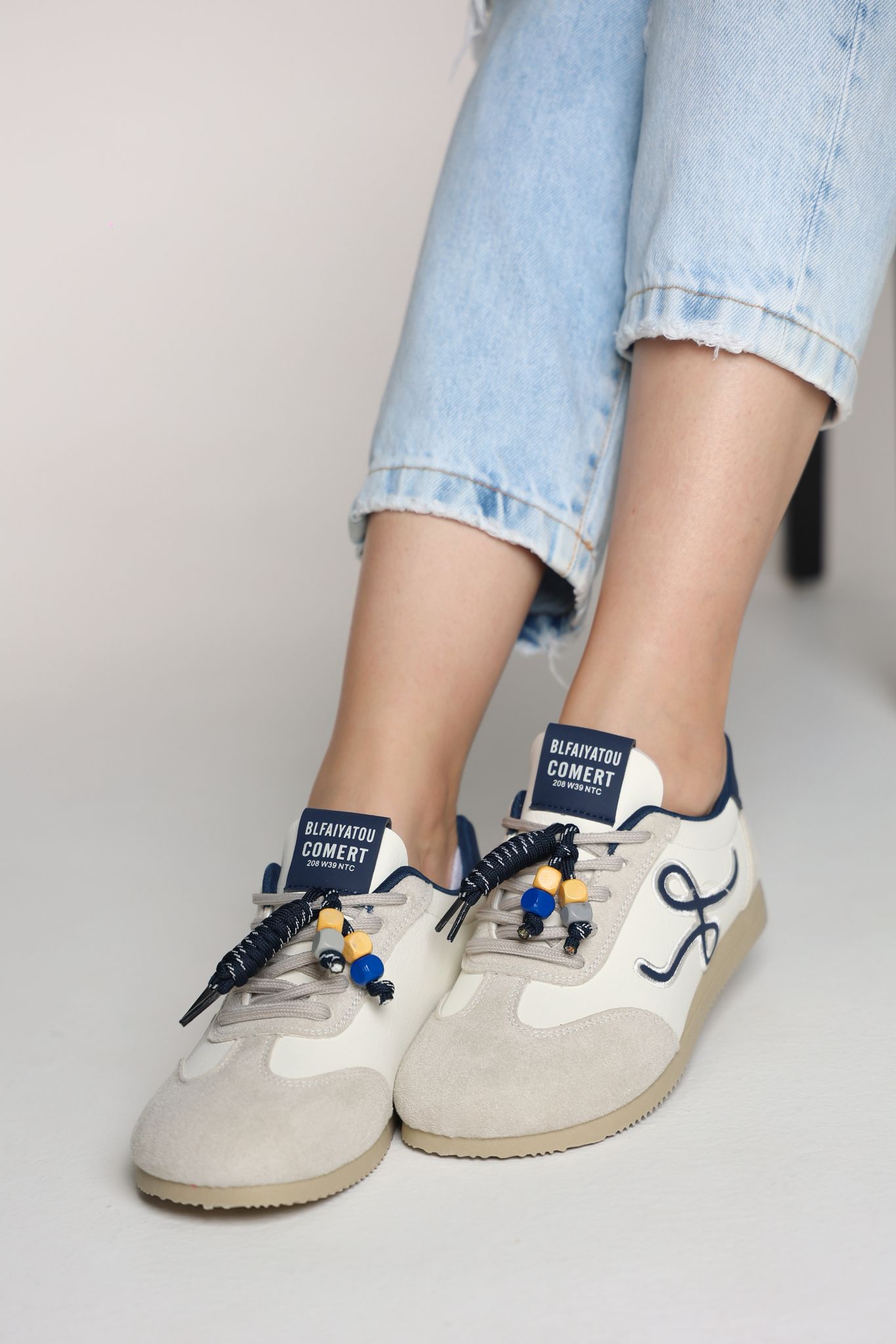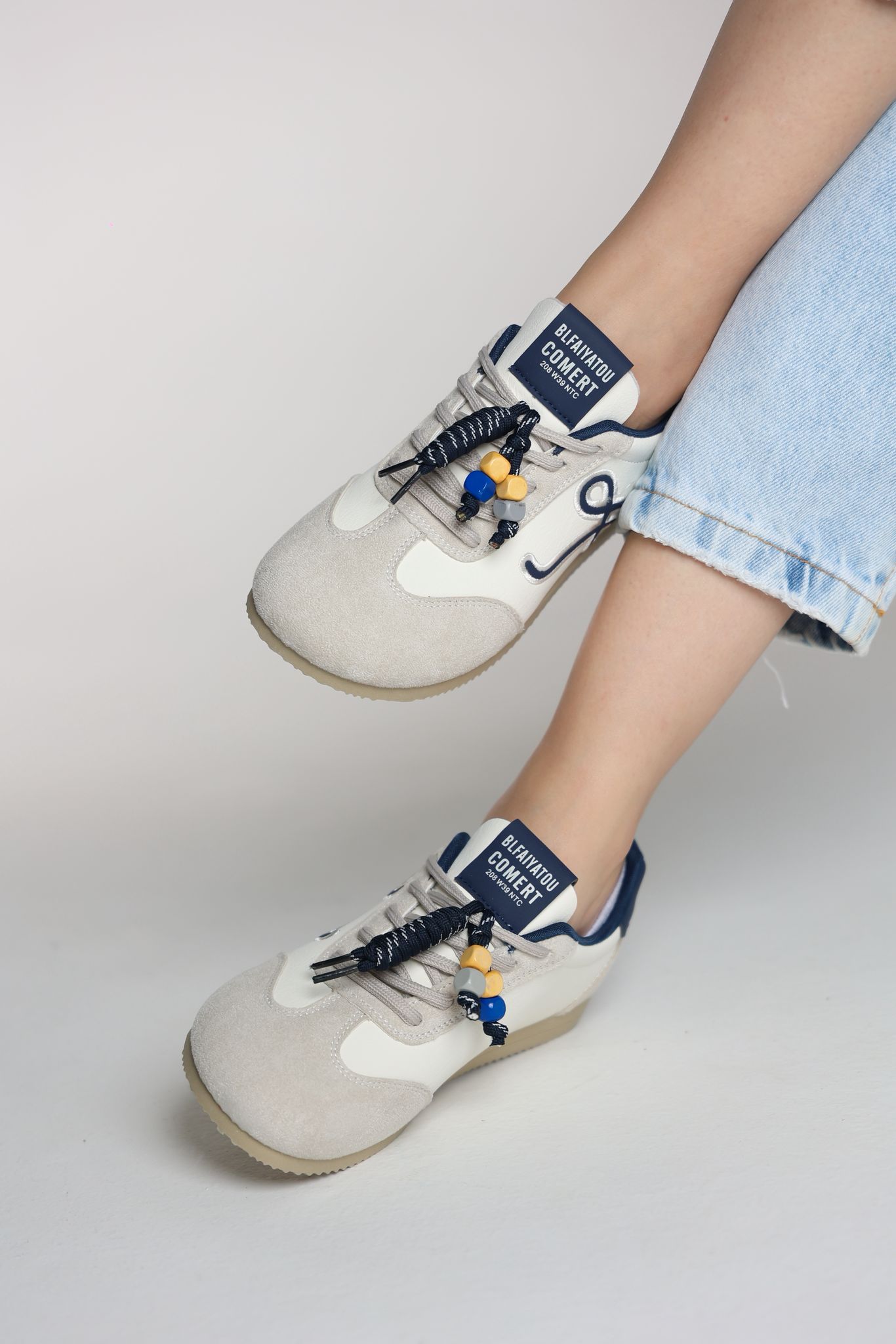 حذاء رياضي بتصميم كلاسيكي أنيق، يجمع بين خامة رمادية ناعمة ولمسات بيضاء تمنحه مظهرًا نظيفًا وعصريًا، مع نعل بلون بني فاتح يضيف لمسة تميّز على الإطلالة.