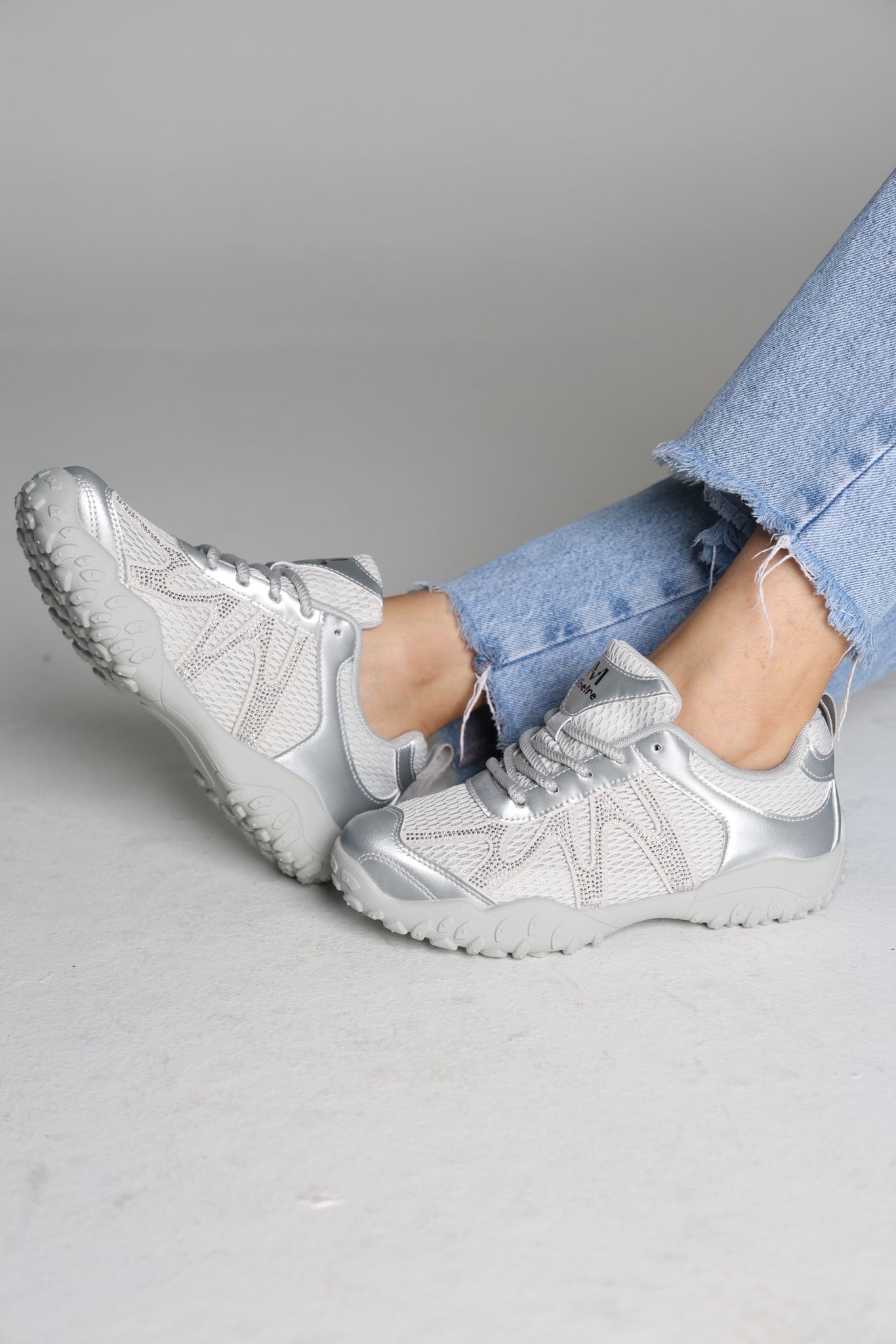 فضي لامع (سيلفر) مع تفاصيل شبكية بلون أبيض مطفي وخطوط تزيينية فضية